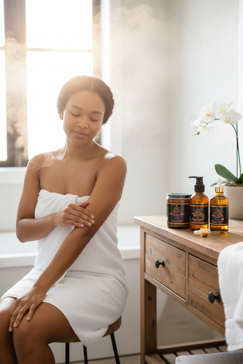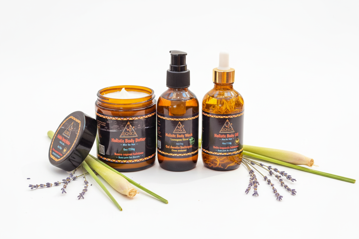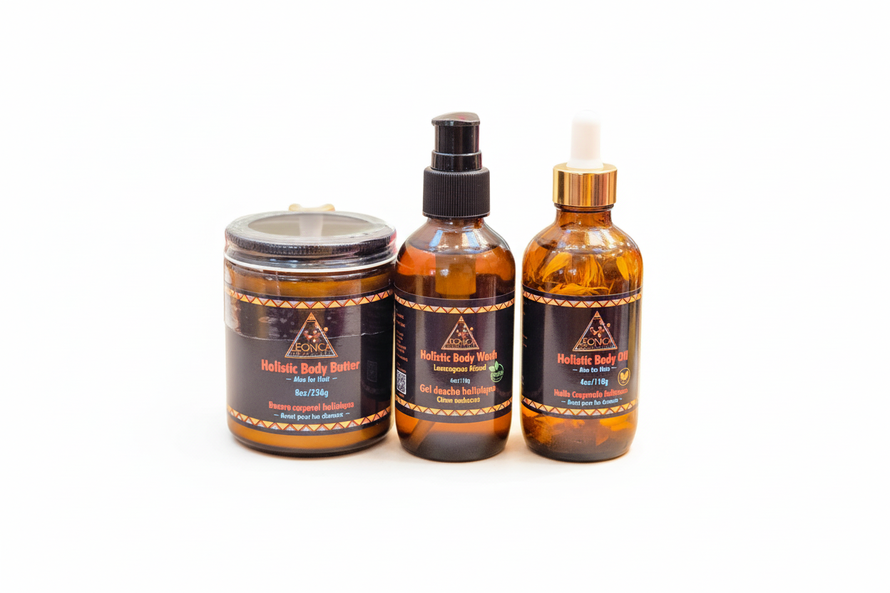 Start with our gentle yet effective cleansers to remove impurities while maintaining your skin’s natural moisture. Follow with our lightweight, nutrient-rich serums to restore hydration and enhance your skin’s radiance. Complete your routine with our deeply moisturizing body Butter, formulated to keep your skin soft, smooth, and glowing all day long. Whether you’re looking to soothe dryness, improve skin texture, or achieve a luminous finish, Leonica’s clean, organic body care helps you feel confident in your skin—naturally!
